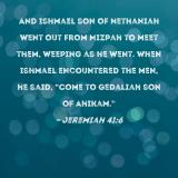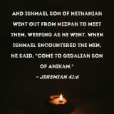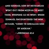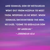 And Ishmael son of Nethaniah went out from Mizpah to meet them, weeping as he went. When Ishmael encountered the men, he said, "Come to Gedaliah son of Ahikam."