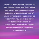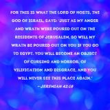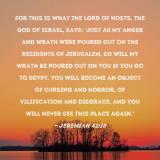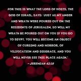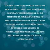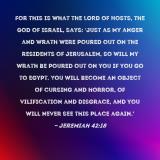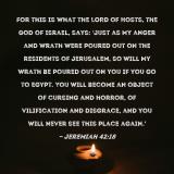 Pictures and Artwork For this is what the LORD of Hosts, the God of Israel, says: 'Just as My anger and wrath were poured out on the residents of Jerusalem, so will My wrath be poured out on you if you go to Egypt. You will become an object of cursing and horror, of vilification and disgrace, and you will never see this place again.' |