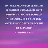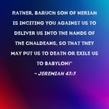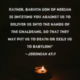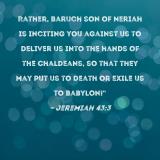 Rather, Baruch son of Neriah is inciting you against us to deliver us into the hands of the Chaldeans, so that they may put us to death or exile us to Babylon!"