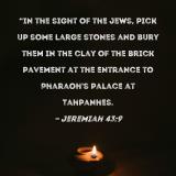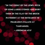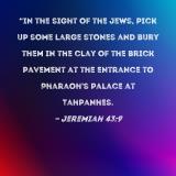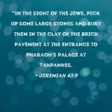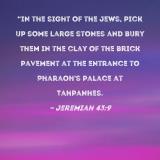 "In the sight of the Jews, pick up some large stones and bury them in the clay of the brick pavement at the entrance to Pharaoh's palace at Tahpanhes.