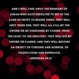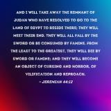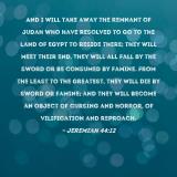 Pictures and Artwork And I will take away the remnant of Judah who have resolved to go to the land of Egypt to reside there; they will meet their end. They will all fall by the sword or be consumed by famine. From the least to the greatest, they will die by sword or famine; and they will become an object of cursing and horror, of vilification and reproach. |