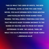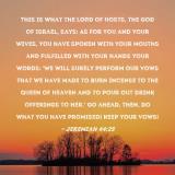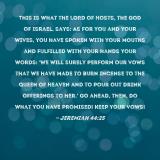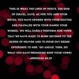 Pictures and Artwork This is what the LORD of Hosts, the God of Israel, says: As for you and your wives, you have spoken with your mouths and fulfilled with your hands your words: 'We will surely perform our vows that we have made to burn incense to the Queen of Heaven and to pour out drink offerings to her.' Go ahead, then, do what you have promised! Keep your vows! |