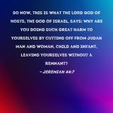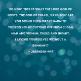 So now, this is what the LORD God of Hosts, the God of Israel, says: Why are you doing such great harm to yourselves by cutting off from Judah man and woman, child and infant, leaving yourselves without a remnant?