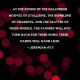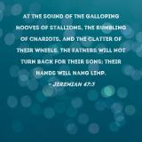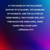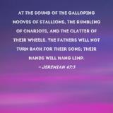 at the sound of the galloping hooves of stallions, the rumbling of chariots, and the clatter of their wheels. The fathers will not turn back for their sons; their hands will hang limp.