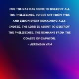 For the day has come to destroy all the Philistines, to cut off from Tyre and Sidon every remaining ally. Indeed, the LORD is about to destroy the Philistines, the remnant from the coasts of Caphtor.