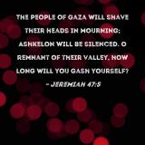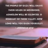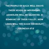 The people of Gaza will shave their heads in mourning; Ashkelon will be silenced. O remnant of their valley, how long will you gash yourself?