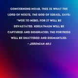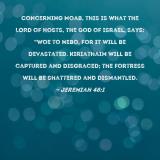Concerning Moab, this is what the LORD of Hosts, the God of Israel, says: "Woe to Nebo, for it will be devastated. Kiriathaim will be captured and disgraced; the fortress will be shattered and dismantled.