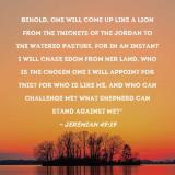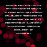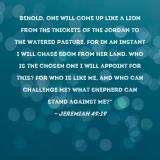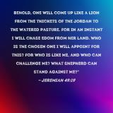 Pictures and Artwork Behold, one will come up like a lion from the thickets of the Jordan to the watered pasture. For in an instant I will chase Edom from her land. Who is the chosen one I will appoint for this? For who is like Me, and who can challenge Me? What shepherd can stand against Me?" |