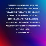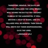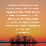 Pictures and Artwork Therefore, behold, the days are coming, declares the LORD, when I will sound the battle cry against Rabbah of the Ammonites. It will become a heap of ruins, and its villages will be burned. Then Israel will drive out their dispossessors, says the LORD. |