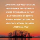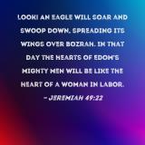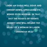 Look! An eagle will soar and swoop down, spreading its wings over Bozrah. In that day the hearts of Edom's mighty men will be like the heart of a woman in labor.