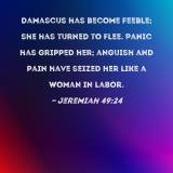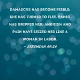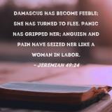 Damascus has become feeble; she has turned to flee. Panic has gripped her; anguish and pain have seized her like a woman in labor.