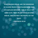 Concerning Kedar and the kingdoms of Hazor, which Nebuchadnezzar king of Babylon defeated, this is what the LORD says: "Rise up, advance against Kedar, and destroy the people of the east!