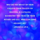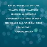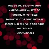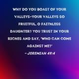 Why do you boast of your valleys--your valleys so fruitful, O faithless daughter? You trust in your riches and say, 'Who can come against me?'
