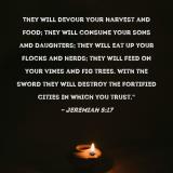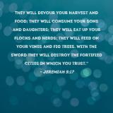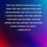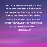 Pictures and Artwork They will devour your harvest and food; they will consume your sons and daughters; they will eat up your flocks and herds; they will feed on your vines and fig trees. With the sword they will destroy the fortified cities in which you trust." |