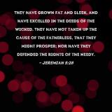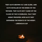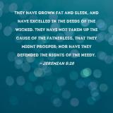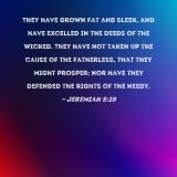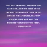 They have grown fat and sleek, and have excelled in the deeds of the wicked. They have not taken up the cause of the fatherless, that they might prosper; nor have they defended the rights of the needy.