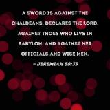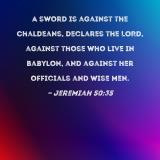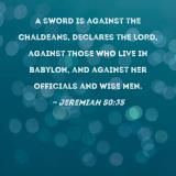 A sword is against the Chaldeans, declares the LORD, against those who live in Babylon, and against her officials and wise men.