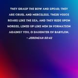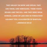 They grasp the bow and spear; they are cruel and merciless. Their voice roars like the sea, and they ride upon horses, lined up like men in formation against you, O Daughter of Babylon.