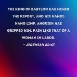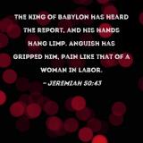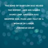 The king of Babylon has heard the report, and his hands hang limp. Anguish has gripped him, pain like that of a woman in labor.