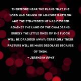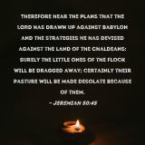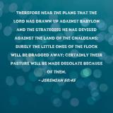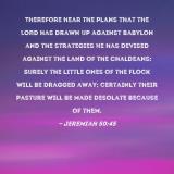 Pictures and Artwork Therefore hear the plans that the LORD has drawn up against Babylon and the strategies He has devised against the land of the Chaldeans: Surely the little ones of the flock will be dragged away; certainly their pasture will be made desolate because of them. |