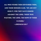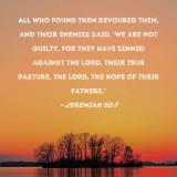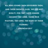 All who found them devoured them, and their enemies said, 'We are not guilty, for they have sinned against the LORD, their true pasture, the LORD, the hope of their fathers.'