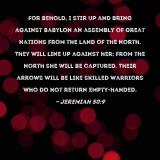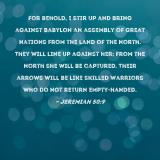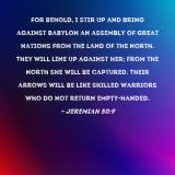 Pictures and Artwork For behold, I stir up and bring against Babylon an assembly of great nations from the land of the north. They will line up against her; from the north she will be captured. Their arrows will be like skilled warriors who do not return empty-handed. |