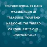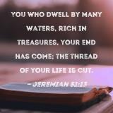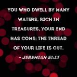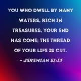 You who dwell by many waters, rich in treasures, your end has come; the thread of your life is cut.