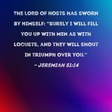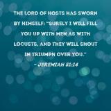 The LORD of Hosts has sworn by Himself: "Surely I will fill you up with men as with locusts, and they will shout in triumph over you."