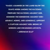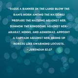 Pictures and Artwork "Raise a banner in the land! Blow the ram's horn among the nations! Prepare the nations against her. Summon the kingdoms against her--Ararat, Minni, and Ashkenaz. Appoint a captain against her; bring up horses like swarming locusts. |