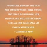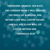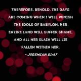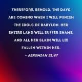 Therefore, behold, the days are coming when I will punish the idols of Babylon. Her entire land will suffer shame, and all her slain will lie fallen within her.