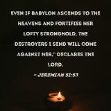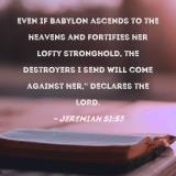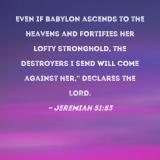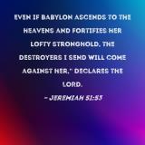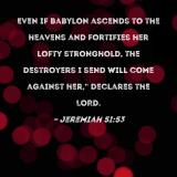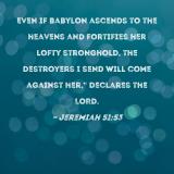 Even if Babylon ascends to the heavens and fortifies her lofty stronghold, the destroyers I send will come against her," declares the LORD.