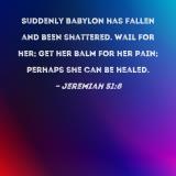 Suddenly Babylon has fallen and been shattered. Wail for her; get her balm for her pain; perhaps she can be healed.
