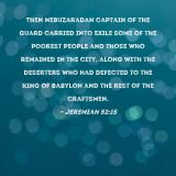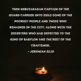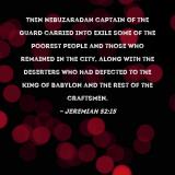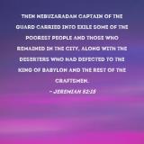 Then Nebuzaradan captain of the guard carried into exile some of the poorest people and those who remained in the city, along with the deserters who had defected to the king of Babylon and the rest of the craftsmen.