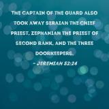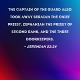 The captain of the guard also took away Seraiah the chief priest, Zephaniah the priest of second rank, and the three doorkeepers.