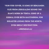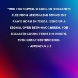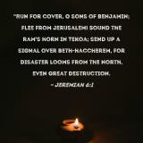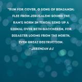 "Run for cover, O sons of Benjamin; flee from Jerusalem! Sound the ram's horn in Tekoa; send up a signal over Beth-haccherem, for disaster looms from the north, even great destruction.