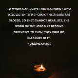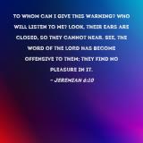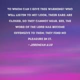 To whom can I give this warning? Who will listen to me? Look, their ears are closed, so they cannot hear. See, the word of the LORD has become offensive to them; they find no pleasure in it.