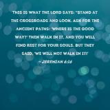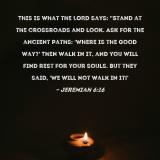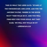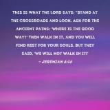 This is what the LORD says: "Stand at the crossroads and look. Ask for the ancient paths: 'Where is the good way?' Then walk in it, and you will find rest for your souls. But they said, 'We will not walk in it!'