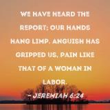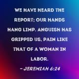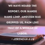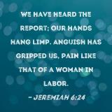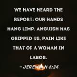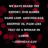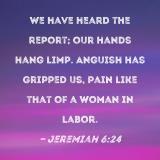 We have heard the report; our hands hang limp. Anguish has gripped us, pain like that of a woman in labor.