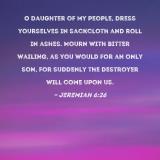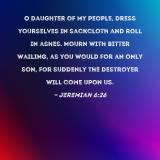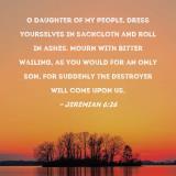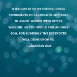 O daughter of my people, dress yourselves in sackcloth and roll in ashes. Mourn with bitter wailing, as you would for an only son, for suddenly the destroyer will come upon us.