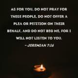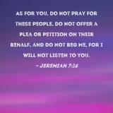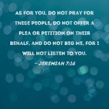 As for you, do not pray for these people, do not offer a plea or petition on their behalf, and do not beg Me, for I will not listen to you.