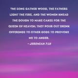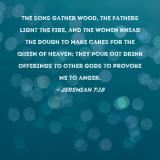 The sons gather wood, the fathers light the fire, and the women knead the dough to make cakes for the Queen of Heaven; they pour out drink offerings to other gods to provoke Me to anger.