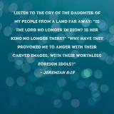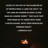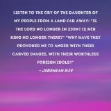 Listen to the cry of the daughter of my people from a land far away: "Is the LORD no longer in Zion? Is her King no longer there?" "Why have they provoked Me to anger with their carved images, with their worthless foreign idols?"