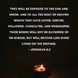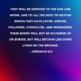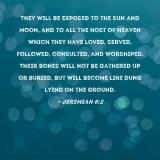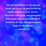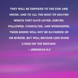 Pictures and Artwork They will be exposed to the sun and moon, and to all the host of heaven which they have loved, served, followed, consulted, and worshiped. Their bones will not be gathered up or buried, but will become like dung lying on the ground. |