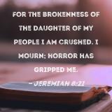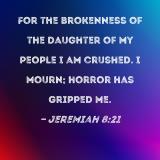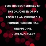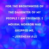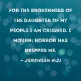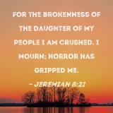 For the brokenness of the daughter of my people I am crushed. I mourn; horror has gripped me.