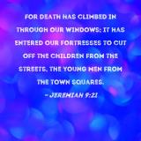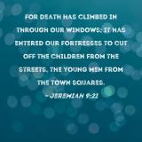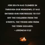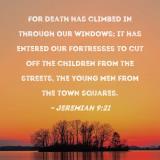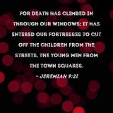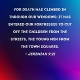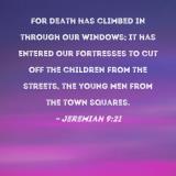For death has climbed in through our windows; it has entered our fortresses to cut off the children from the streets, the young men from the town squares.