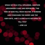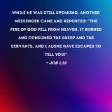 While he was still speaking, another messenger came and reported: "The fire of God fell from heaven. It burned and consumed the sheep and the servants, and I alone have escaped to tell you!"