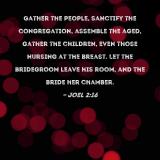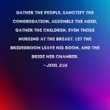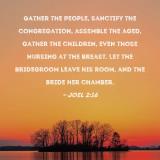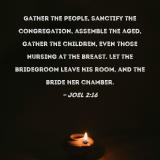 Gather the people, sanctify the congregation, assemble the aged, gather the children, even those nursing at the breast. Let the bridegroom leave his room, and the bride her chamber.