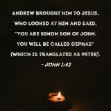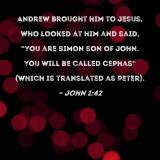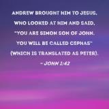 Andrew brought him to Jesus, who looked at him and said, "You are Simon son of John. You will be called Cephas" (which is translated as Peter).