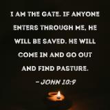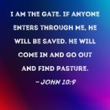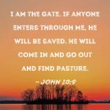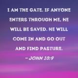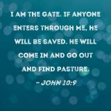 I am the gate. If anyone enters through Me, he will be saved. He will come in and go out and find pasture.