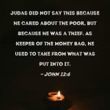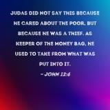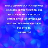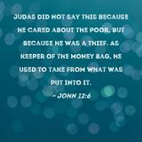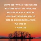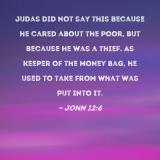 Judas did not say this because he cared about the poor, but because he was a thief. As keeper of the money bag, he used to take from what was put into it.