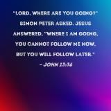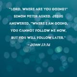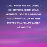 "Lord, where are You going?" Simon Peter asked. Jesus answered, "Where I am going, you cannot follow Me now, but you will follow later."